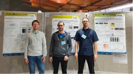 Figure: Birk Fritsch (left), Andreas Hutzler (center), and Andreas Körner (right) in front of their Posters at the Gordon Research Conference on Liquid Phase Electron Microscopy 2022. The awarded poster is displayed on the right.