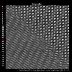 This month’s image shows the crystal structure of a cobalt-base superalloy at atomic resolution (image width: 12 nm) recorded using scanning transmission electron microscopy. Superalloys of this type are produced to withstand extreme environments with temperatures above 1000 °C. In the image, you can see a change in the atomic ordering: On the bottom left, there is the so-called γ phase which is designed to be a part of the superalloy’s microstructure. Towards the top right, we see another phase, the χ phase, which can form in this alloy after long-term heat treatment and is undesired. By closely looking at the boundary between the two phases, we can learn how one transforms into the other at the atomic level and thereby how to possibly influence the formation of this phase – and ultimately how the properties of the superalloy may be further improved.