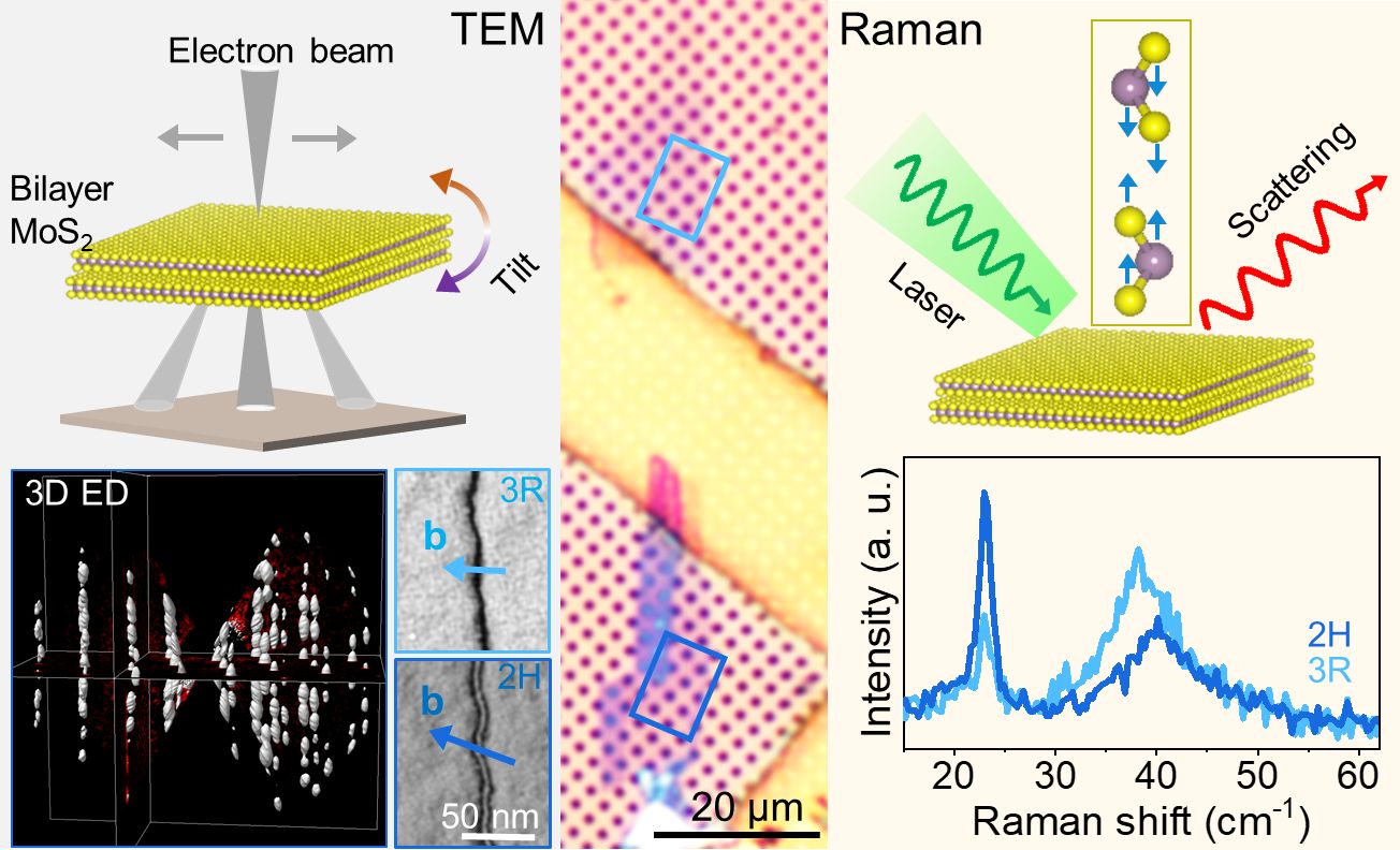 Researchers at the Institute of Micro and Nanostructure Research (IMN) and the Center for Nanoanalysis and Electron Microscopy (CENEM), Chair of Experimental Physics, Institute for Crystallography and Structural Physics (ICSP) at FAU Erlangen-Nürnberg, have unveiled an unexpected coexistence of 2H and 3R stacking orders—and their characteristic dislocations—inside a single exfoliated bilayer MoS₂ flake. The findings, published this week in npj 2D Materials & Applications, demonstrate a correlative transmission electron microscopy (TEM) and low-frequency Raman workflow that resolves stacking sequences from the nanoscale to the millimetre scale.