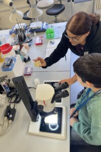At the SEM, the focus shifted to imaging very fine details with electrons. After examining the stars and globe on a 1-cent coin – structures barely visible to the naked eye – each child volunteered a hair, whose thickness (about 50–100 μm) was measured and compared with the ~1600 μm thickness of the coin. Finally, cross-sections of a Morpho butterfly wing and a jay feather were imaged, making the colour-producing nanostructures directly visible.