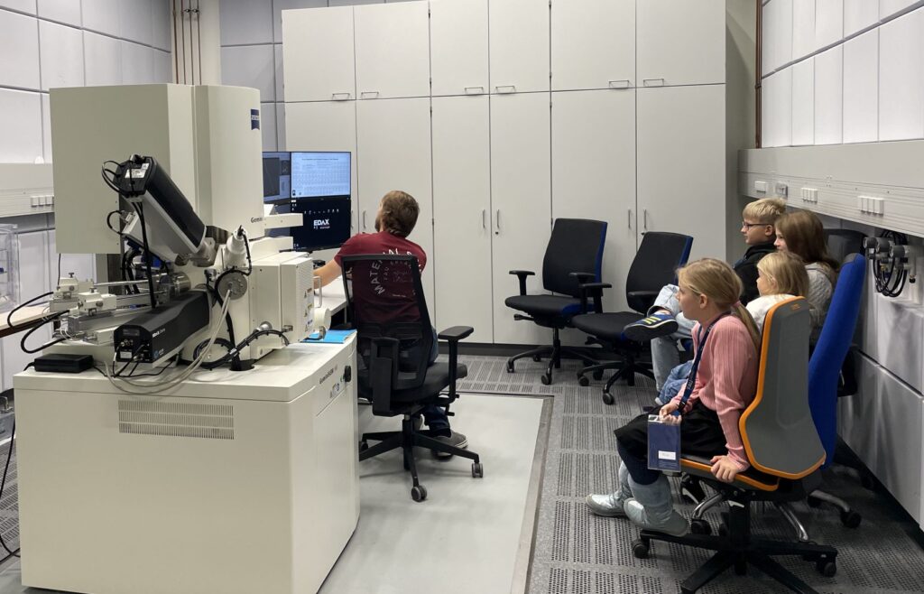 In small groups, the young visitors then rotated between the preparation laboratory and the scanning electron microscope (SEM). In the preparation lab, they gained their first hands-on experience with a stereo microscope, examining the wings of a Morpho butterfly (Morpho didius) and a green hairstreak (Callophrys rubi). Using light and electron microscopy images, differences in the wing-scale structures were explained and linked to the origin of structural colour. A simple experiment with ethanol on a Morpho wing showed how changing the surrounding medium shifts the reflected wavelength – the wing temporarily appeared green.