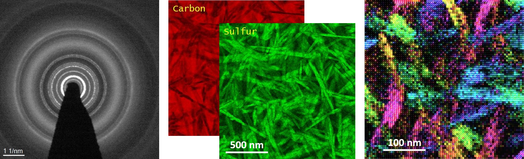Transmission electron microcopy (TEM) is suitable to deliver a multitude of sample information at the required spatial resolution. However, there are till several challenges: 1) due to the similarity of the organic materials involved in the active layer regarding their chemical composition, the contrast in TEM images is often uniform and no significant structures can be identified, 2) organic crystals are extremely sensitive to high-energy electrons: a small dose is already enough to destroy the crystal structure, which made high resolution imaging almost impossible. Thus conventional imaging techniques are often not sufficient. Our Cs-corrected Titan Themis3 300 is equipped with a Gatan imaging filter for Analytical Transmission Electron Microscopy. Analytical TEM is a versatile tool to characterize the morphology and material distribution of organic solar cells concerning on the one hand the interfaces of the various layers and on the other hand the active layer itself. This is achieved by combining high resolution imaging with analytical techniques like electron energy-loss spectroscopy (EELS) and energy-filtered TEM (EFTEM) as well as energy-dispersive X-ray spectroscopy (EDXS). To get insight into the crystal structure and interface character at molecule level, new techniques are being developed and implemented, including low-dose imaging techniques, diffraction-based methods and analysis routines. We also have access to ultimate dicrect-detection cameras via established collaboration projects, which allow extremely low-dose imaging of organic crystals.